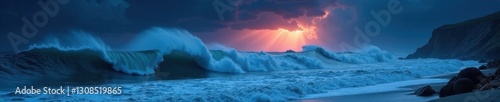 Naklejka premium Violent ocean storm, huge waves under a raging night sky , spray, turbulent,...