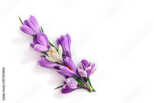 © Anastasiia Malinich, Obraz premium Violet and white flowers crocuses on a white background with space for text. Top view, flat lay. Spring flowers