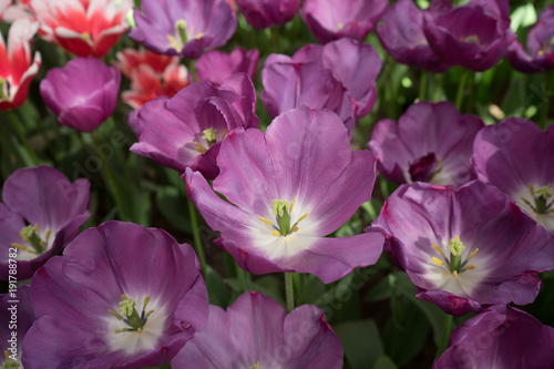 Naklejka premium Violet color tulip flowers in a garden in Lisse, Netherlands, Europe