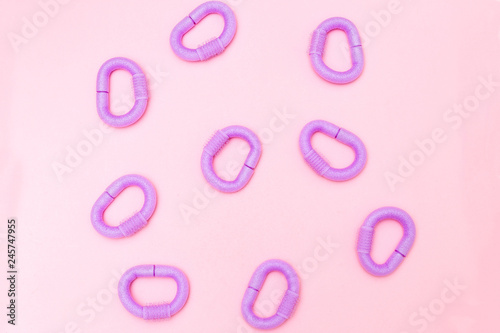 © _nastassia, Fototapeta premium Violet hair curlers on pink background. Flat lay