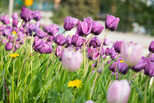 Fototapeta premium Violet tulip flowers on flowerbed in city park