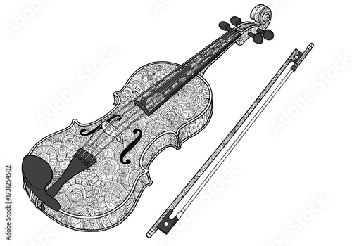Obraz premium Violin and bow decorated with zentangle designs, line art, black and white