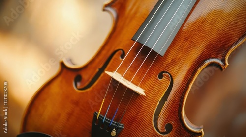 © Phata, Fototapeta premium Violin and bow on chair, close-up of violin strings and bow resting, soft lighting