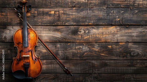 Naklejka premium Violin and bow on rustic wood background. Overhead view of a violin and bow on a rustic wood background, perfect for music or vintage-themed projects.