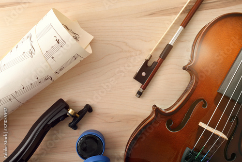 Naklejka premium Violin and equipment on wooden table top