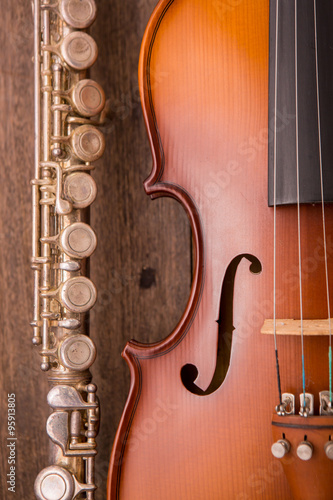 Fototapeta premium violin and flute in vintage style on wood background