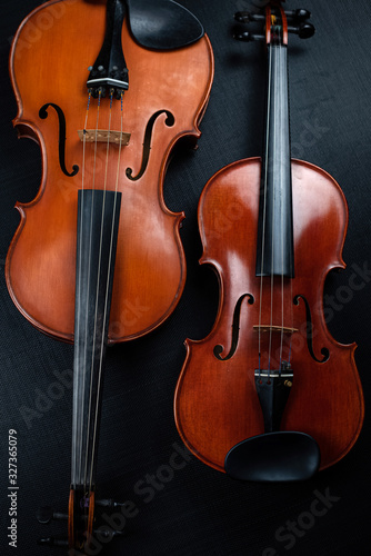 © Watcharin, Fototapeta premium Violin and Viola put on background,show front side of acoustic instrument