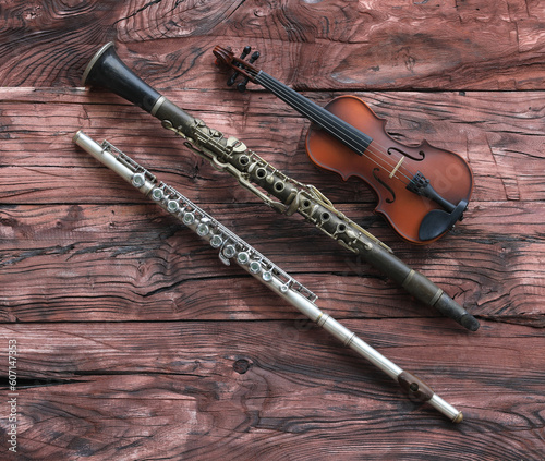 Naklejka premium violin, clarinet and flute on a red wooden table