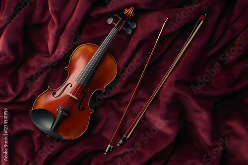 © Matija, Fototapeta premium violin, classical violin, musical instrument, elegant violin, vintage violin, wooden violin, glossy finish, violin bow, deep red fabric, velvet background