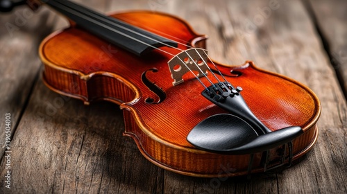 Fototapeta premium Violin detail, warm wood tones, black pegs & bridge, strings, on wooden surface
