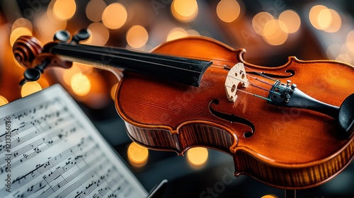 © ROY, Fototapeta premium Violin on stand with sheet music and bokeh lights.