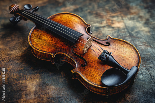 © Halima, Fototapeta premium Violin resting on wood surface.