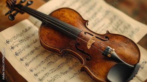 Fototapeta premium Violin with bow resting on sheet music, classical instrument in focus, warm and elegant setting, soft lighting