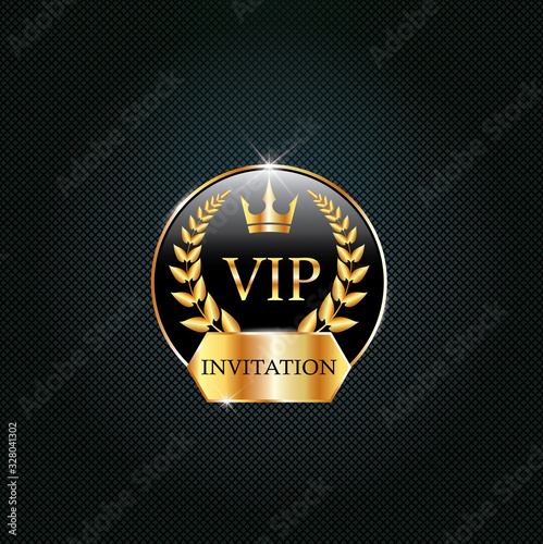 © Migogo, Naklejka premium Vip black label with golden crown, laurel wreath. Luxury design for invitation, greeting card, poster, brochure, label on dark background. Vector premium card design.
