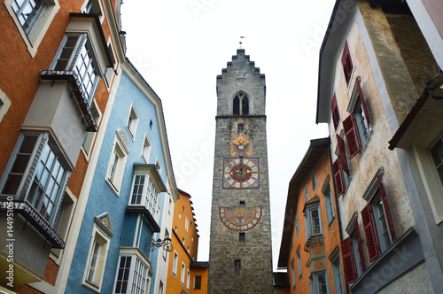 © zigres, Fototapeta premium VIPITENO, ITALY - NOVEMBER 23, 2016: Medieval tower clock with colorful houses in Via Città Nuova, center of Vipiteno, historic village classified among the most beautiful in Italy, South Tyrol, Italy