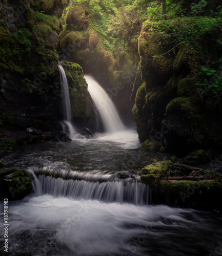 © Gregory, Fototapeta premium Virgin Creek waterfall in the forest in Girdwood, Alaska
