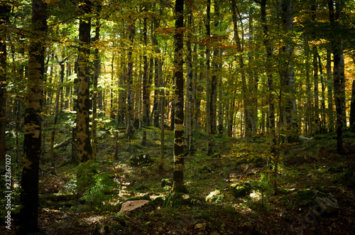 Obraz premium Virgin dense forest of beech trees in the autumn.