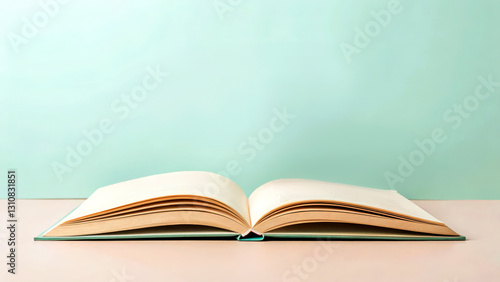 © InspiredCraftStudio, Obraz premium virtual classroom education with accessibility Concept Open book on a mint green background, showcasing its pages.