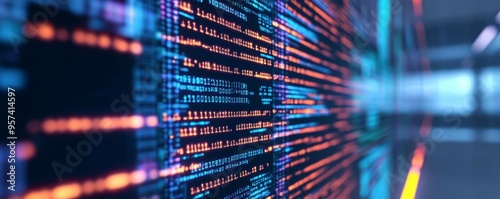 © LIPO@SEXTAO22, Fototapeta premium Virtual code blocks, futuristic developer, sleek tech lab, neon highlights