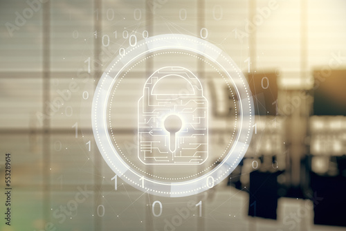 Obraz premium Virtual creative lock symbol and microcircuit illustration on a modern conference room background. Protection and firewall concept. Multiexposure