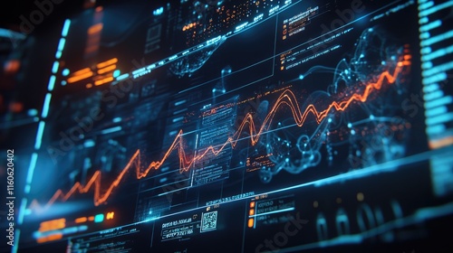 Fototapeta premium Virtual medical HUD elements including DNA formulas, electrocardiogram monitors, and body scans, showing cutting-edge health diagnostics and data analysis.