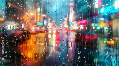 © Asia, Fototapeta premium Virtual raindrops cascade down a digital pane, warping the outside world into a captivating blur of color and shape.