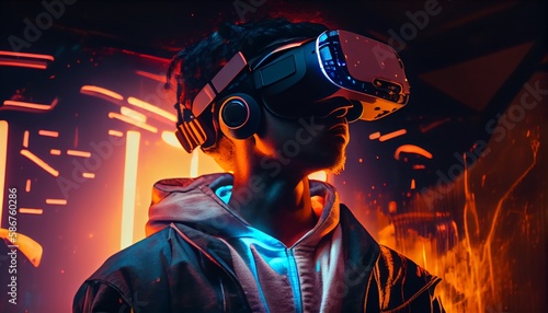 Fototapeta premium Virtual reality digital technology concept. Man wearing 3d VR headset glasses...