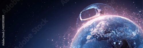 Obraz premium Virtual Reality Headset Enhances Online Learning With a Glowing Hologram Globe in a Dynamic Educational Environment