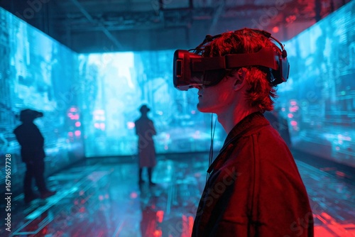 © PixelPulse, Fototapeta premium Virtual Reality Immersion Exploring Futuristic Worlds with VR Headset Technology