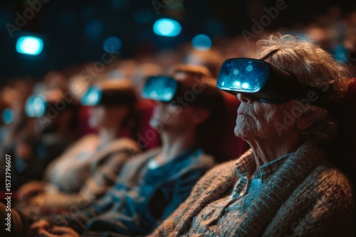 Obraz premium Virtual reality immersive Experience: A group of individuals, immersed in a...