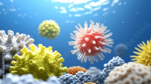 © Prim2513, Obraz premium virus and antivirus concept. Colorful microorganisms floating in a vibrant underwater environment.