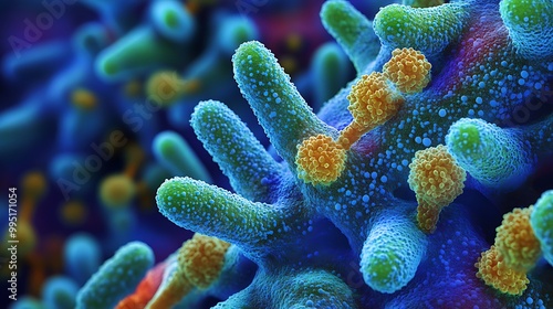 Naklejka premium Virus Binding to Lung Cells A detailed view of virus particles binding to receptors on lung epithelial cells, showing the early stages of infection.