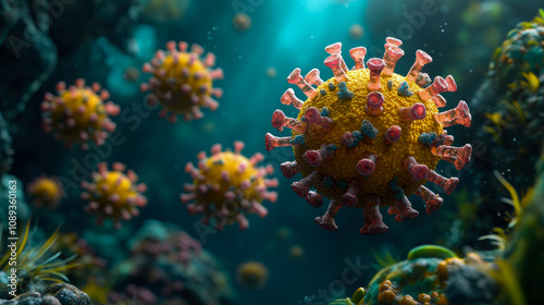 Fototapeta premium Virus particles are shown in a vibrant underwater setting, illustrating their...