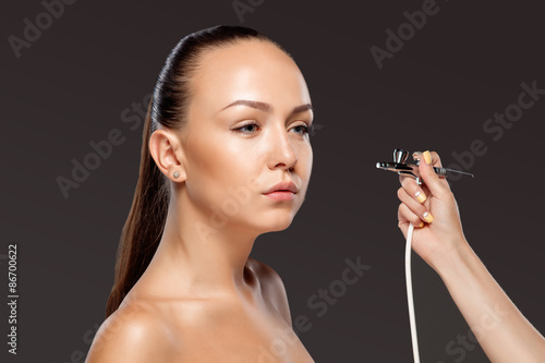 Obraz premium visagist making makeup for model with aerograph