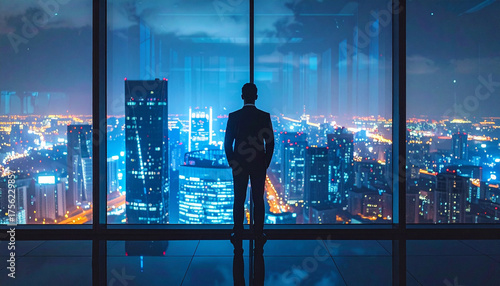 Obraz premium Visionary at Dusk: A silhouette of an executive stands before a panoramic...
