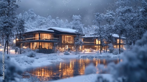 © Nawarit, Fototapeta premium Visiting a winter lodge with glowing AR interactive tour features, serene snowy landscape, soft ambient lighting, photorealistic
