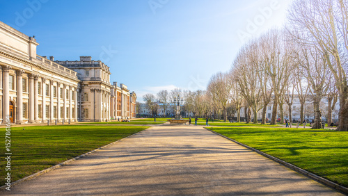 Naklejka premium Visitors stroll through the well-maintained gardens of the Old Royal Naval College in Greenwich, enjoying the sunny day and historic architecture framed by leafless trees.