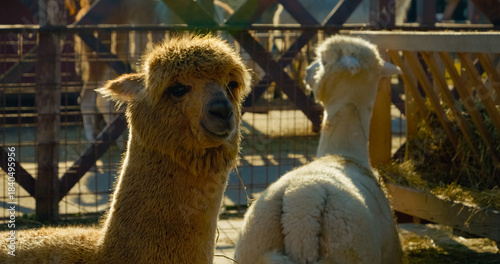 © RecCameraStock, Obraz premium Visitors to the alpaca farm interact with friendly alpacas, exploring the serene environment filled with greenery and farm activities. This location is perfect for animal lovers and families.