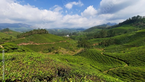 Fototapeta premium Vista a los campos de te en los valles de Munnar, Kerala, India