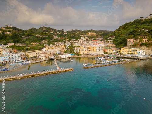 © Claudio Quacquarelli, Fototapeta premium Vista aerea dell'alba del porto di Lacco Ameno ad Ischia. Roccia, mare, sole e mille colori