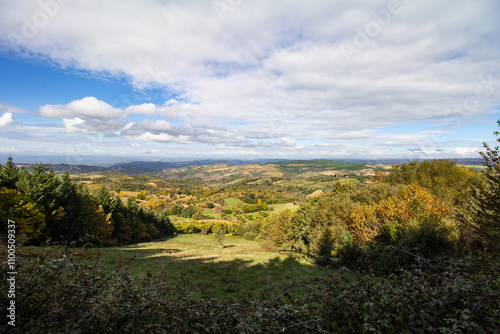 © celso claro, Fototapeta premium Vista da montanha para os vales verdes sob um céu azul com algumas nuvens brancas