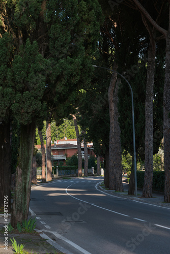 © Tomas, Fototapeta premium Vista del viale alberato di pini che porta a Montecatini Alto durante un caldo tramonto autunnale con la luce del sole che filtra attraverso i rami degli alberi.