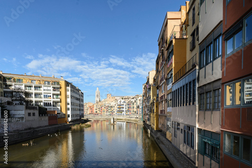 © gurb101088, Fototapeta premium Vista escénica de la ciudad de Girona , casa típicas colores anaranjados sobre el rio Onyar un dia soleado de Diciembre. Girona, Cataluña, España