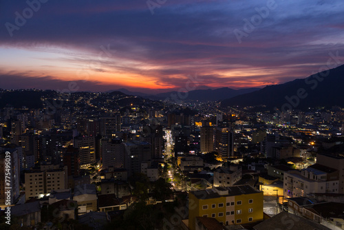 © Luiz Barrionuevo, Fototapeta premium Vista panorâmica ao anoitecer - POÇOS DE CALDAS, MG, BRAZIL - JULY 18, 2023: Panoramic view of the city from the Santa Rita viewpoint at Golden Hour, with its dramatic colors.