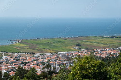 © LuIvDa, Naklejka premium Vista panorâmica da costa de Viana do Castelo em contraste entre o núcleo urbano litoral, os campos agrícolas e o vasto oceano atlântico em Portugal