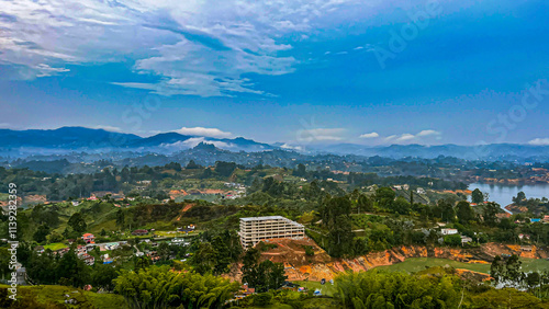© lukisebasss, Obraz premium Vista panorámica desde la cima de El Peñón ubicado en Guatape, Antioquia, Colombia.