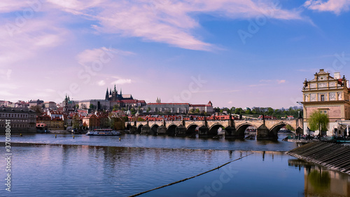 Naklejka premium Vista panóramica del Puente de Carlos que atraviesa el río Moldava conectando...