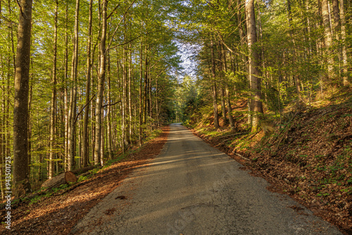 © PhotoMet, Fototapeta premium vista panoramica sull'interno di una bellissima foresta con alti alberi verdi, nelle montagne del nord est Italia, vicino a Tarvisio, di giorno, in primavera, illuminate dalla luce brillante del sole