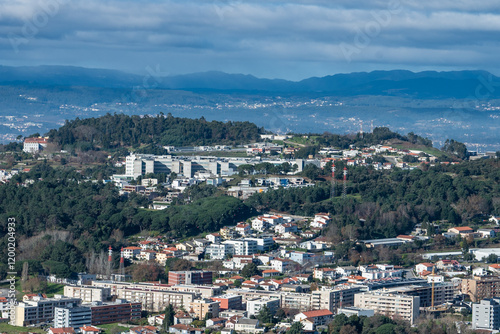 Fototapeta premium Vista parcial da encantadora cidade de Braga, capturada a partir do icônico Bom Jesus do Monte. A paisagem revela a harmonia entre a arquitetura urbana e o verde das colinas, destacando o charme histó