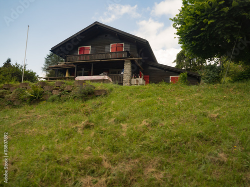 © acaballero67, Fototapeta premium Vistas de una casa de madera en el campo verde desde abajo en Rochers de Naye, Suiza verano de 2016